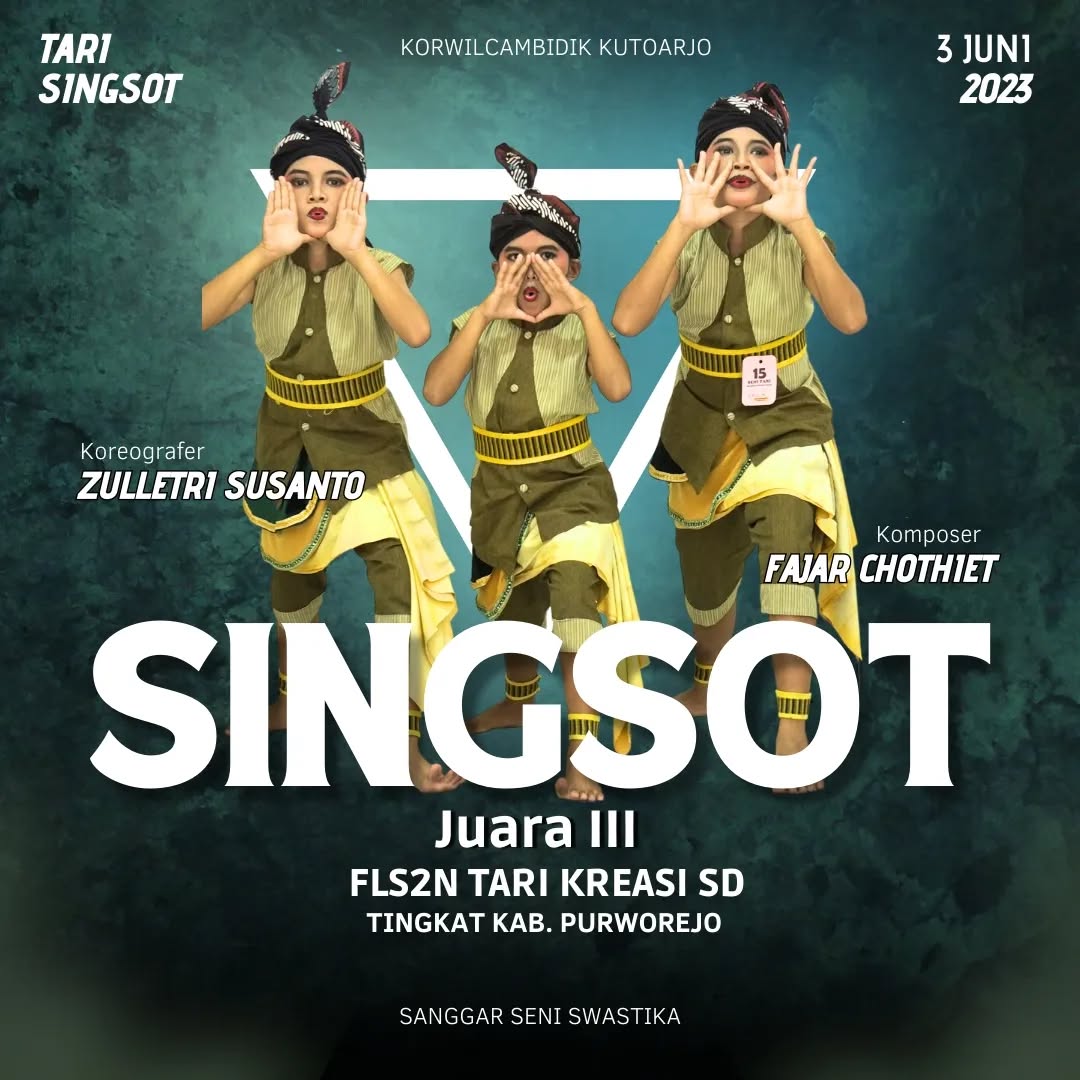 Sanggar Seni Swastika dengan bangga membagikan capaian dalam Festival Lomba Seni Siswa Nasional (FLS2N) Tari Kreasi SD Tingkat Kabupaten Purworejo pada 3 Juni 2023. Karya yang dibawakan oleh perwakilan dari KORWILCAMBDIDIK Kutoarjo, yaitu Tari Singsot, berhasil meraih Juara III. Tarian ini merupakan hasil kolaborasi kreatif dari Koreografer Zulletri Susanto dan Komposer Fajar Chothiet.